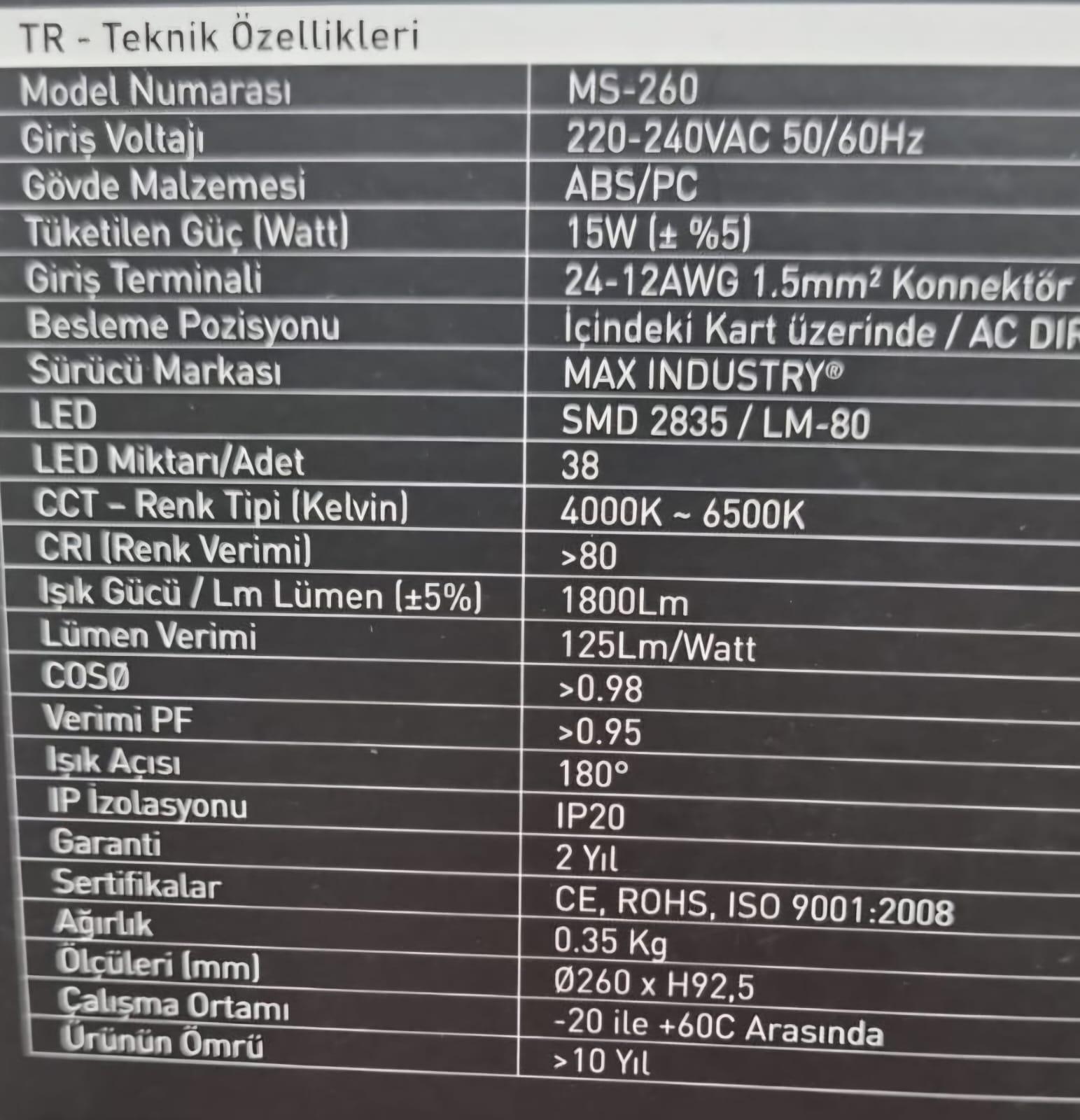 LEDRAM 4000K LED ARMATÜR-LEDRAM 15WAT LED ARMATÜR 4000K -MS-260